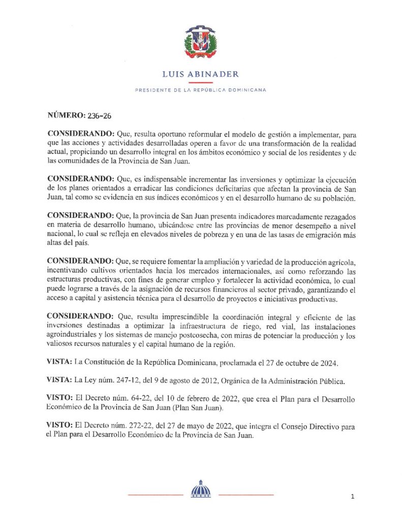 Santo Domingo. – El presidente Luis Abinader emitió los decretos 236-26 y 285-26 que tienen el propósito de dar continuidad a las acciones para el desarrollo integral en los ámbitos económico y social de los residentes y comunidades de la provincia San Juan.